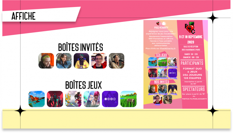 Pixel 4 Charity est un projet fictif de citoyenneté numérique réalisé dans le cadre de ma première année en BUT MMI (Métiers du Multimédia et de l’Internet). Ce projet de groupe avait pour objectif d’imaginer et de concevoir un événement à la fois ludique et caritatif : une LAN solidaire destinée à récolter des fonds pour une association. Nous avons choisi de créer une compétition de jeux vidéo en ligne dont les bénéfices seraient reversés à une cause humanitaire.
